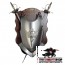 This impressive display plaque is perfect for period properties and themed attractions alike. This full-size weaponry display adds a sense of grandeur wherever it is placed. The Renaissance style breastplate is hand crafted in Italy and features the crowned double-headed eagle coat of arms of the Augsburg Empire. Behind the breastplate are two cup-hilted 16th century swords with antique brass plated hilts and steel blades (made for display only). The wooden display plaque is stained in a dark oak finish and features hanging loops on the back.